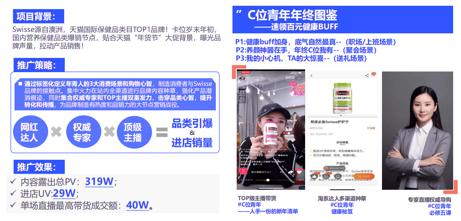 推廣策略:通過標簽化定義年輕人的3大消費場景和購物心智,制造消費者與Swisse品牌的接觸點。集中火力在站內全渠道進行品牌內容種草,強化產品潛消痕跡,同時集合權威專家和TOP主播雙重發力,擊穿品類心智,提升轉化和傳播,為品牌制造有熱度和品銷力的大節點營銷戰役。
